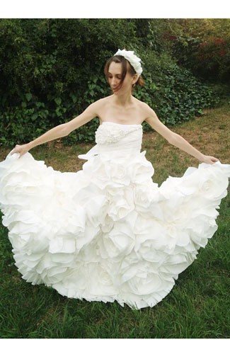 Gaun karya seorang wanita bernama Laurine ini terinspirasi dari taman. Dia membuat gaun dari tisu toilet dengan teknik origami yang membentuk kelopak bunga mawar.