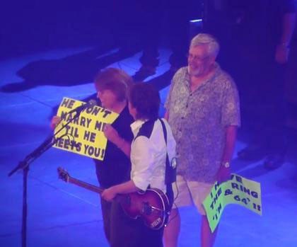 Paul kemudian meminta Claudia dan John naik ke atas panggung. Personel The Beatles itu lalu memperkenalkan keduanya pada penonton konsernya. Saat berada di atas panggung diketahui juga ternyata John pun membawa poster dengan tulisan yang berhubungan dengan keinginan menikah kekasihnya, 'I've got the ring & I'm 64'. John kemudian melantunkan lagu dari The Beatles 'When I'm Sixty Four', setelah sedikit melantunkan suaranya, John pun bersimpuh dan melamar Claudia. Pastinya lamaran yang sudah dinanti itu diterima oleh Claudia. Paul pun ikut tersenyum bahagia bersama pasangan tersebut.