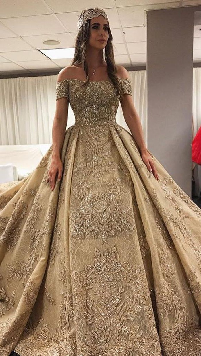 Lolita sendiri mengenakan gaun pernikahan bak putri raja berwarna emas dari Zuhair Murad. Gaunnya tersebut bahkan hingga menyapu lantai beberapa meter. Melengkapi busananya, wanita 22 tahun itu menggunakan hiasan kepala.