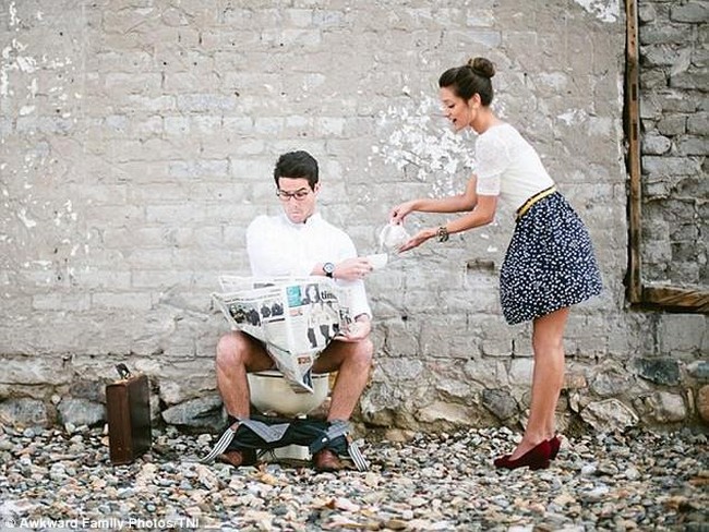 Ya, pria tersebut berpose duduk di toilet sambil baca koran dan meminta secangkir kopi. Sementara sang wanita menuangkan teko berisi kopi ke cangkir yang dipegang pasangannya. Foto juga memperlihatkan bagaimana sang pria benar-benar membuka celananya dan serius membaca koran. Ini menjadi foto pre-wedding paling aneh yang pernah ada.