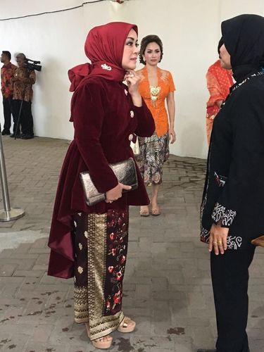 Aktris senior Chintami Atmanegara menjatuhkan pilihannya pada kebaya modern bernuansa merah marun. Aktris berhijab itu memakai blus velvet berpeplum dipadu dengan songket yang bermotif sulaman bunga. (dng/kik)