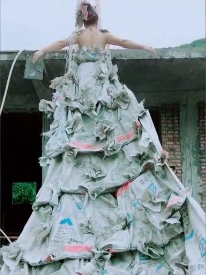 Petani di China ini menjadi viral karena karya fashionnya yang membuat takjub. Dia mendesain gaun pengantin yang terbuat dari kantong semen bekas.