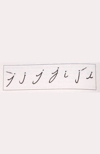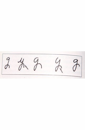13. Huruf kecil 'g', 'j', dan 'y' melingkar dengan coretan akhir mengarah ke atas