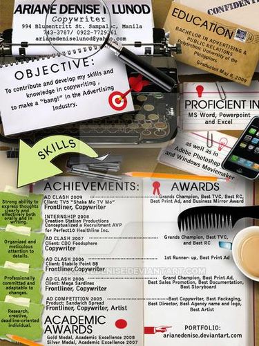 Contoh lain dalam penulisan CV adalah seperti miliki seorang wanita bernama Ariane Denise yang bekerja sebagai copywriter. CV-nya dipenuhi ilustrasi namun informasi yang disajikan tetap jelas dan terarah. (int/hst)