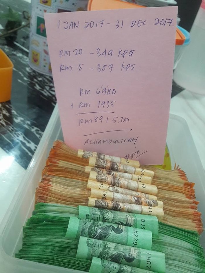 Azlin memisahkan uang yang akan ia tabung yakni pecahan RM5 dan RM20 dan kemudian menyimpannya di celengan. Ia mulai menabung pada tanggal 1 Januari 2017 sampai 31 Desember 2017. Selama satu tahun, ia berhasil mengumpulkan 349 pecahan uang RM20 dan 387 uang RM5, yang membuatnya sangat bahagia.